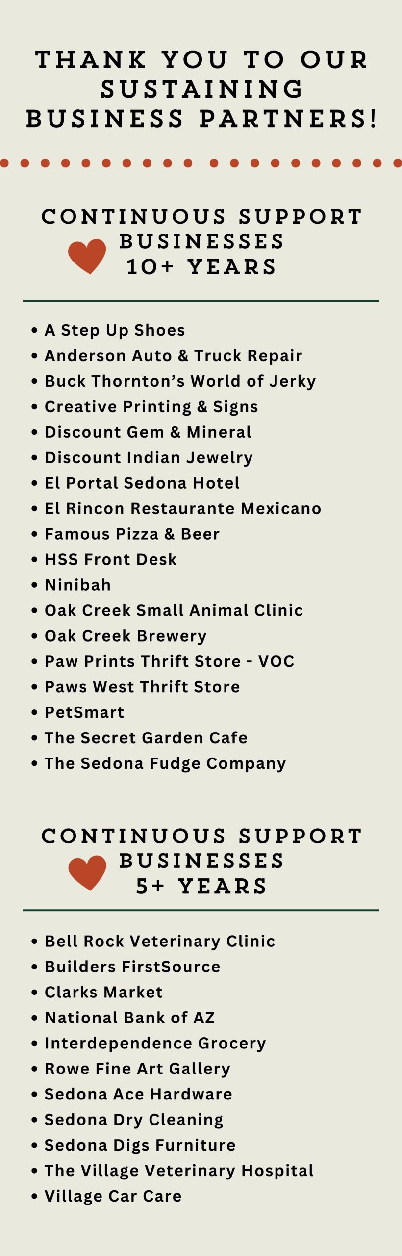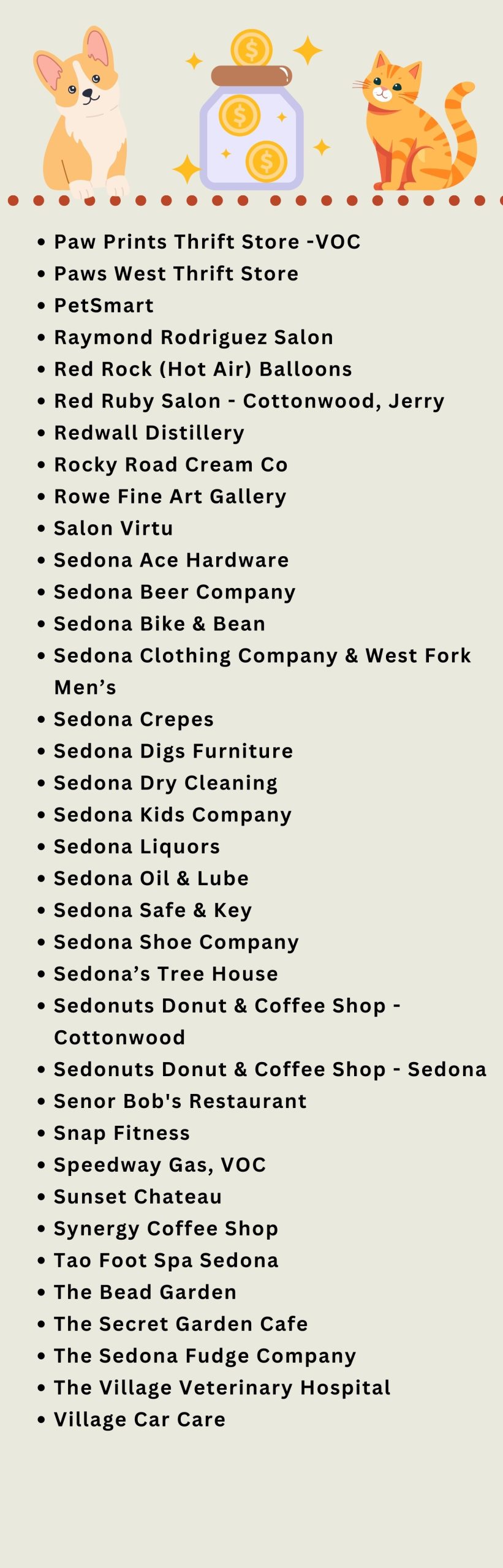 Our appreciation goes out to these businesses, and all the others, for helping to save abandoned and disowned companion pets through the Humane Society of Sedona Donation Canisters Program.