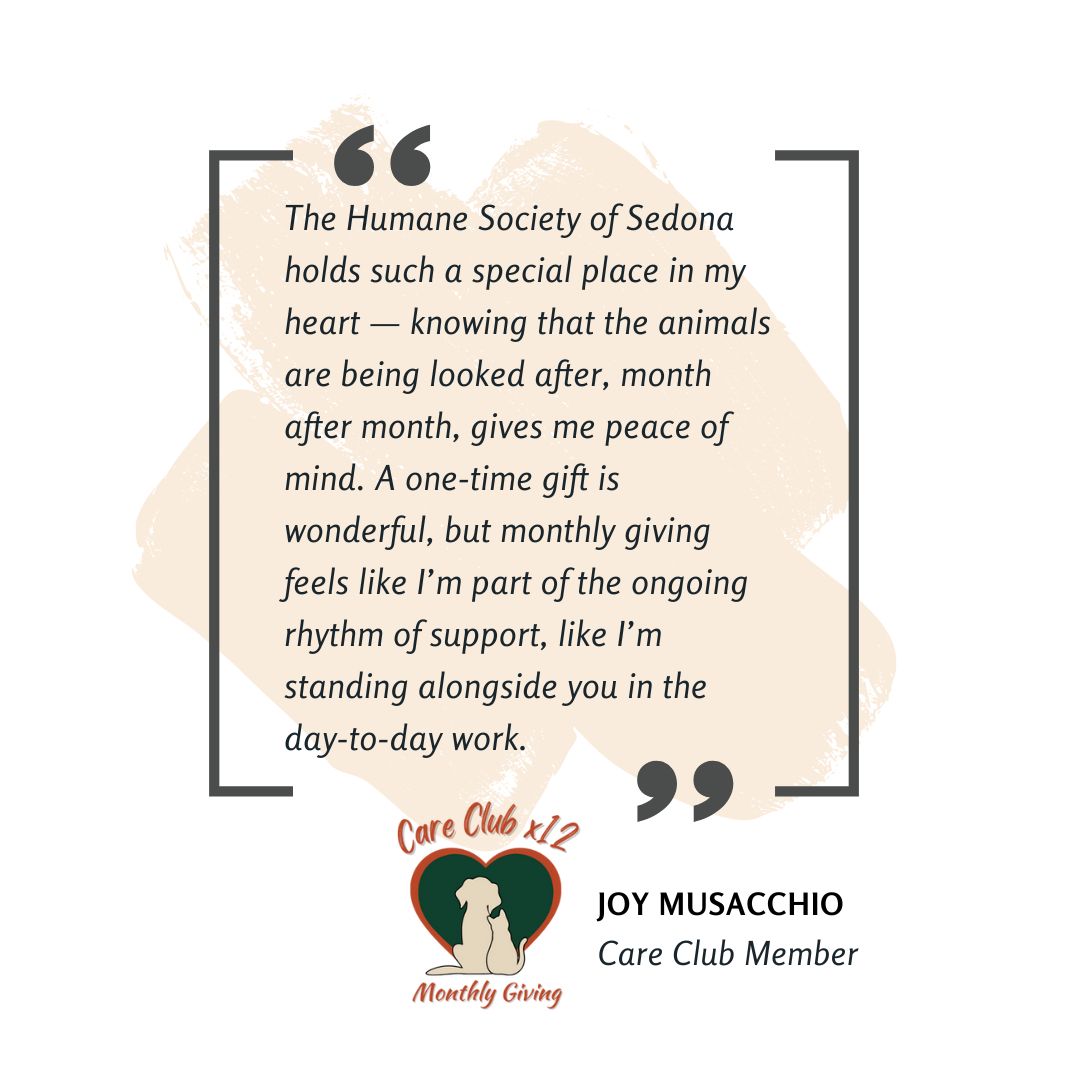 Having consistent, predictable income is critical to our ability to provide care for the hundreds of homeless, hurting, abandoned animals the Humane Society of Sedona cares for each year. Being able to rely on monthly donations helps us to manage our programs and services and plan for the future.