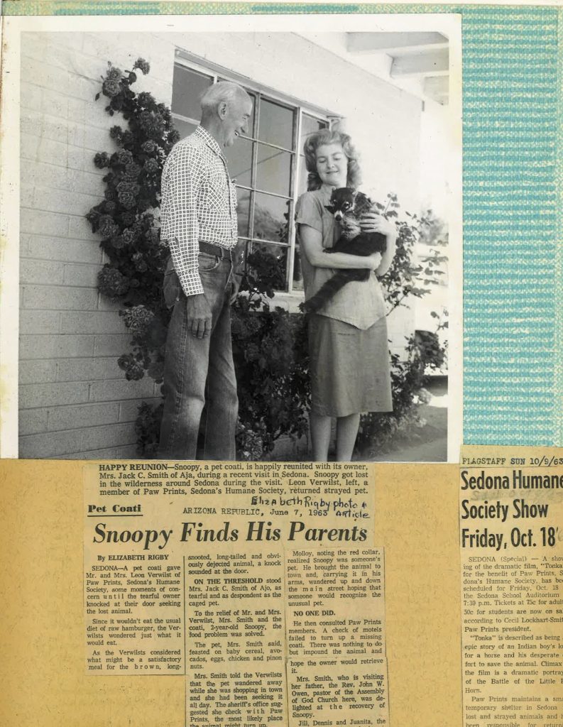 Just as happens now at the Shelter, the Verwilsts would sometimes find themselves the caretakers of some pretty unusual, lost companion pets. A June 7, 1963 Arizona Republic article reports the loss, and happy reunion, of a pet coati. Fortunately, the tame coati was wearing a red collar when found by a caring Sedona resident, Mr. John Molloy, who suspected the little guy was a pet and brought him to Paw Prints for care. It was not long before his pet parent, Mrs. Smith, came looking for him and lovingly scooped him up in her arms. It turns out, ‘Snoopy’ was aptly named and we hope he resisted leaving his family to snoop around town after that.
