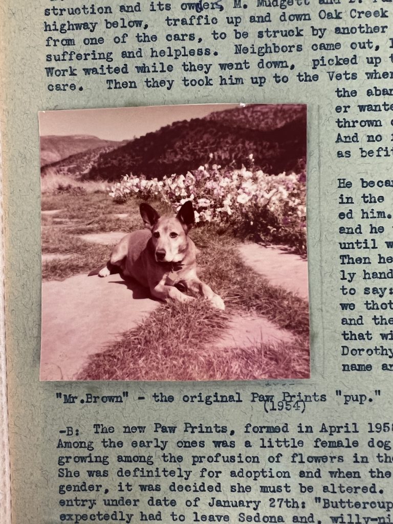 Being an artist, Dorothy was inspired by his welcoming forefoot, created the first ‘Paw Print’ logo in Mr. Brown’s honor, and influenced the name of the first fledging shelter in Sedona. Today, Mr. Brown’s legacy and ‘paw print’ lives on in the passion of HSS’s mission and even in the name of the HSS Village of Oak Creek Thrift Store—Paw Prints.